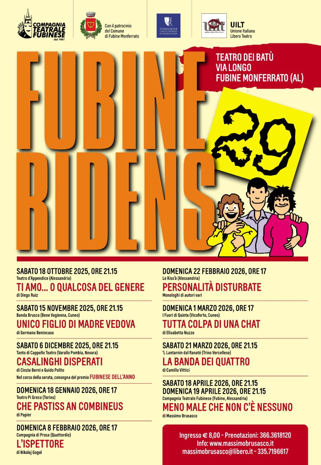Ecco il cartellone di Fubine Ridens, edizione numero 29. Ospiteremo compagnie dalle province di Vercelli, Novara, Cuneo, Torino, ovviamente Alessandria e, rispetto agli altri anni, ampliamo l’offerta proponendo anche alcuni spettacoli la domenica pomeriggio (nel periodo invernale).