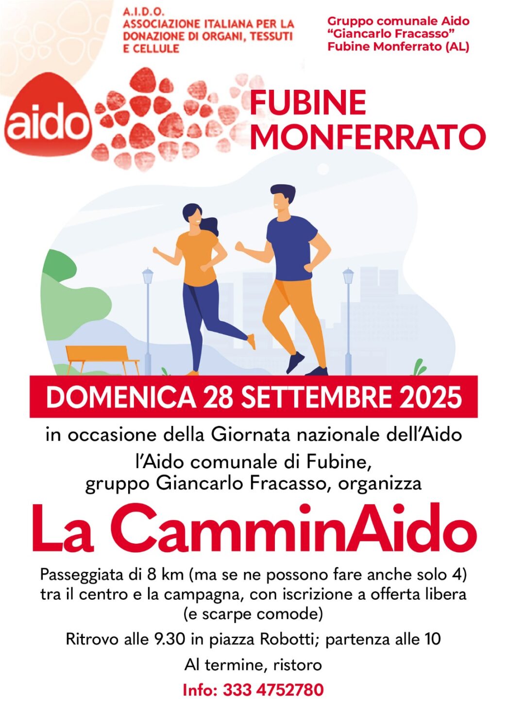 Il Gruppo Aido di Fubine Monferrato, intitolato a Giancarlo Fracasso, torna a proporre la CamminAido, una passeggiata di 8 km (oppure 4) che si svolgerà a Fubine domenica 28 settembre alle ore 10.